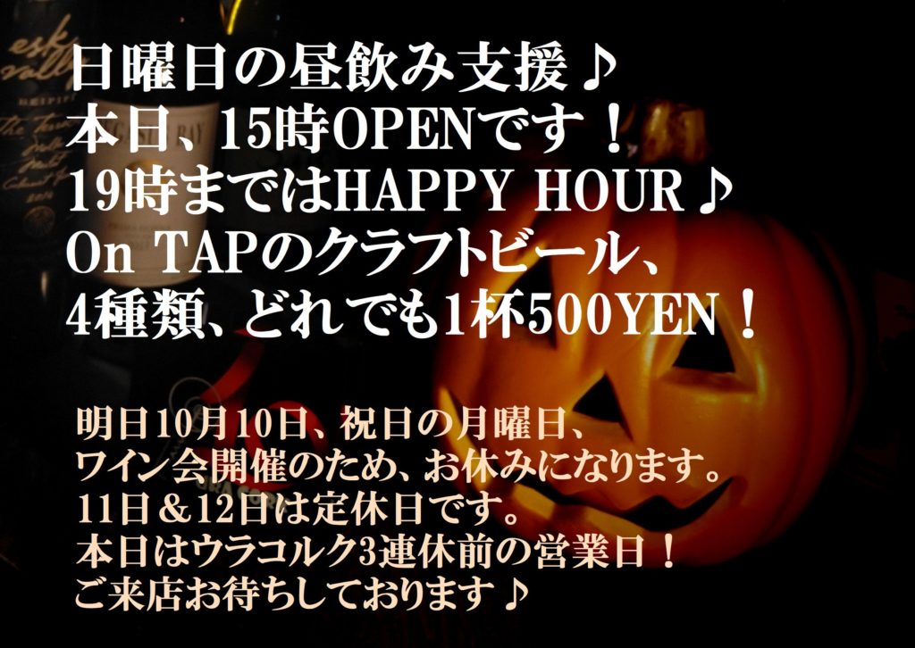 ワインが美味しい季節、今回も満席御礼、素敵なイベントになりそうな予感ですが、Wine Bar URACORKはお休み、そのあと11日、12日は定休日ですので、明日からは3日間おやすみとなります。