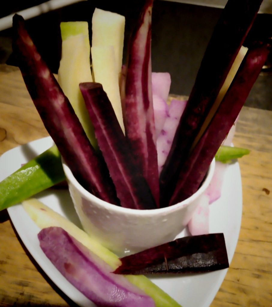 黒人参や紫色の大根をふんだんに使った根菜のスティックサラダ、そして生ベーコン、にんにく、オリーブオイルとバルサミコで仕上げた、ほうれん草の温サラダ。