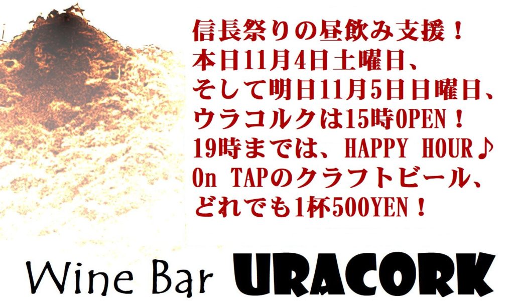 信長祭りの昼飲み支援、Wine Bar URACORK、本日15時OPEN♪